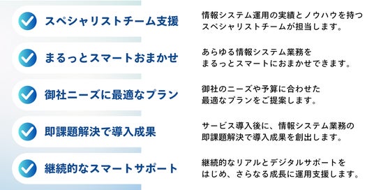 「スマート情シス」は、顧客企業の情報システム部門として、スペシャリストチームが企業ニーズに合わせたAI・DX導入活用による業務改革を安心安全にまるっとスマートに課題を解決し、さらなる成長に持続的にサポートし続けます。日本のAI・DX化に取り組んでまいります。どうぞご期待ください。