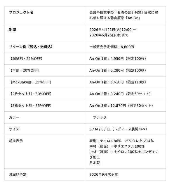 岡山を拠点にQOL向上アイテムを展開する株式会社Toride は、コントロールが難しい急な「腹鳴り(お腹の鳴る音)」を独自の3層構造で軽減する、静音腹巻「An-On」を、2026年4月21日(火)12:00より、応援購入サービスMakuakeにて先行販売を開始いたします。