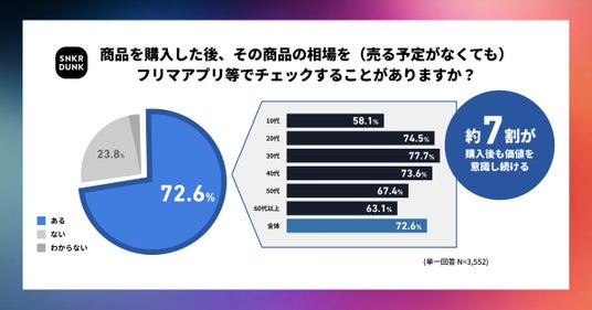 さらに、約7割の人がモノの購入後、売る予定がなくてもフリマアプリなどで相場を見て価値を意識し続けると回答しました。(※3)つまり、相場情報は売却時に必要な情報だけではなく、モノを所有している間にも把握したい情報であることがわかりました。年代別にみても、全年代を通して「価値を確認する」と回答した人が過半数を超え、世代関係なく『相場思考』の価値観が定着していることがうかがえます。