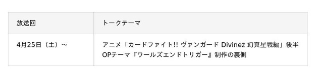 番組では、Ryo’LEFTY’Miyataが楽曲提供と編曲を担当したアニメ「カードファイト!! ヴァンガード Divinez 幻真星戦編」の後半OPテーマ『ワールズエンドトリガー』の制作の裏側を語ります。