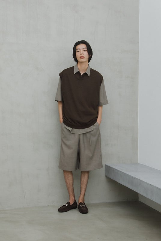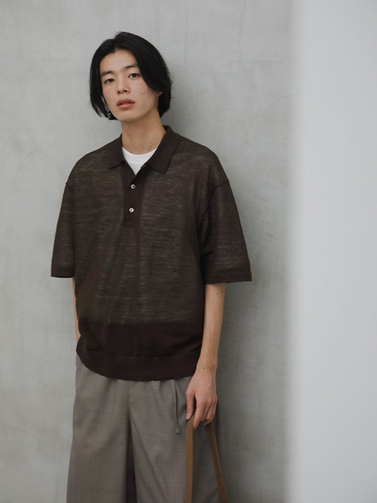 硬めのシャリ感とシルクのような上品な光沢感が特徴のラミー素材を、ゆっくりと時間をかけてハイゲージに編み立てたニットポロ。元々はカットソーに近い前立て部分に芯地を貼った仕様にしています。さらに、襟の角度と前開きの開き方がキレイに収まるのが特徴です。