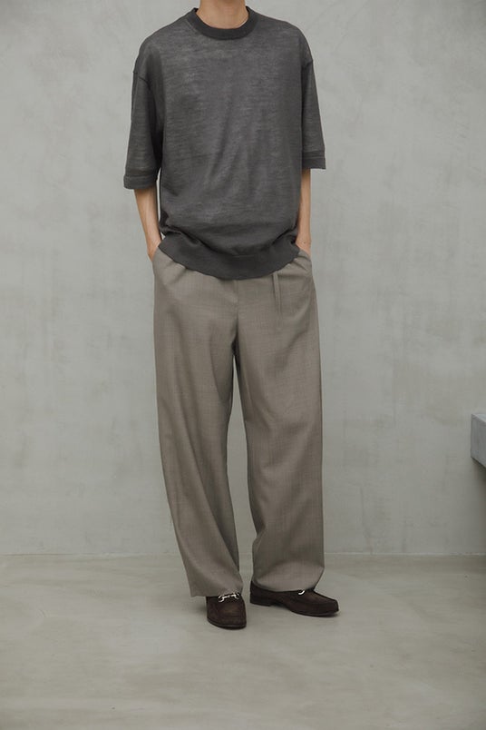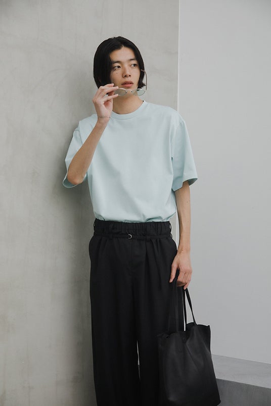 トレンド傾向のカーブシルエットが特徴のメリノウールを使用したトロピカル素材のイージーパンツ。取り外しができる共布の細いベルト付きで、スタイリングによって使い分けて着用ができるのもポイントです。