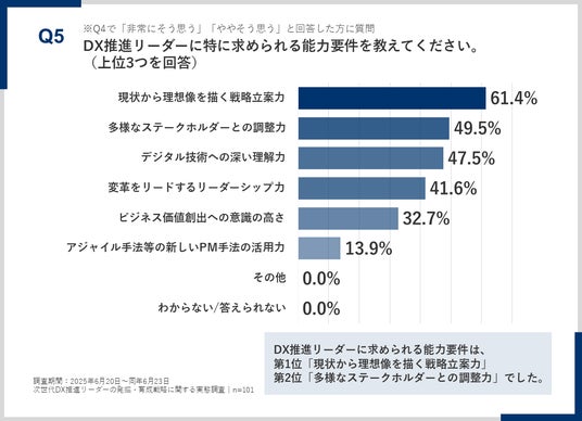 「Q5.DX推進リーダーに特に求められる能力要件を教えてください。」(n=101)と質問したところ、第1位は「現状から理想像を描く戦略立案力」61.4%、第2位は「多様なステークホルダーとの調整力」が49.5%という回答となりました。