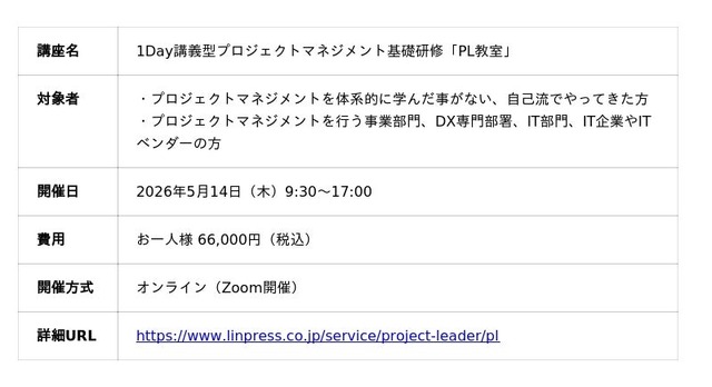 リンプレスでは、多くの企業が課題を感じているDX推進リーダー育成をご支援するため、「プロジェクトマネジメントの基礎知識」とプロジェクトリーダーの役割・必要なスキルを体系的に学ぶ入門編プログラム『PL教室』を開催いたします。