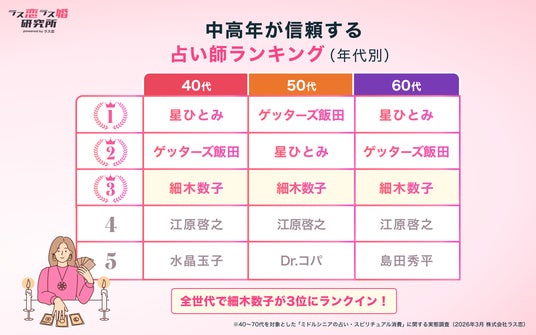 調査では、ユーザーの80%が「運命の出会い」を信じ、89.3%が恋愛で占いや相性診断を参考にしていることが判明。また信頼する占い師の総合ランキングでは1位・星ひとみさん、2位・ゲッターズ飯田さん、3位に2021年に逝去した細木数子さんがランクインし、没後も中高年に根強く支持されていることが明らかになりました。