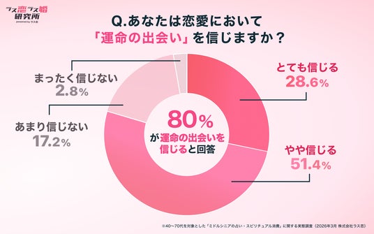 ・中高年の8割が「運命の出会い」を信じている-「とても信じる」28.6%、「やや信じる」51.4%、合計80%が運命の出会いを肯定しています。