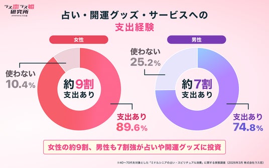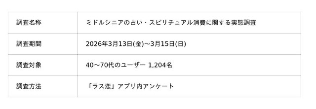 株式会社ラス恋(アイザックグループ/本社:東京都渋谷区/代表取締役CEO:山口 昂星)が運営する、40代・50代・60代を中心に人生経験でつながるマッチングアプリ「ラス恋」は、2026年3月、ユーザー1,204名を対象に「中高年の占い・スピリチュアル消費」に関する調査を実施しました。