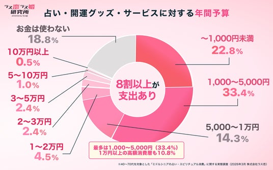 占いや開運グッズへの年間予算について尋ねたところ、「お金は使わない」と回答したのは18.8%のみで、81.2%が何らかの形でサービス・グッズを購入していることがわかりました。