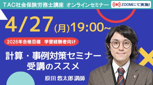社会保険労務士試験対策講座を展開しているTAC株式会社(東京都千代田区)は、今年の本試験受験者に向けた無料オンラインセミナーを4/27(月)19時より開催します。