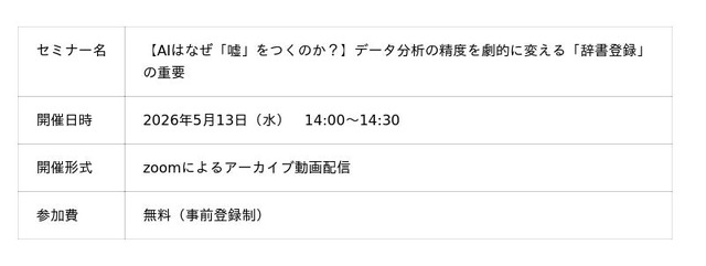 インターネット黎明期から企業のデジタルマーケティングを支援している株式会社メディックス(本社:東京都千代田区、代表取締役社長:田中 正則、以下:メディックス)は、無料オンラインセミナー『【AIはなぜ「嘘」をつくのか?】データ分析の精度を劇的に変える「辞書登録」の重要性』を再開催いたします。