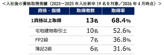 宅地建物取引士やFP等の資格取得を通じて、個々の成長を可視化しています。自身の成長を実感できる仕組みが、日々のモチベーションの向上および定着につながっています。