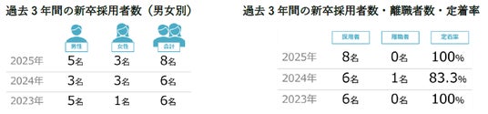 当社における過去3年間の新卒社員の定着率は、2023年および2025年で100%、2024年でも83.3%と高水準で推移しており、離職者はほぼゼロとなっています。また、同期間の新卒採用人数は2023年・2024年が各6名、2025年が8名と、一定の採用規模を維持しながら安定した定着を実現しています。
