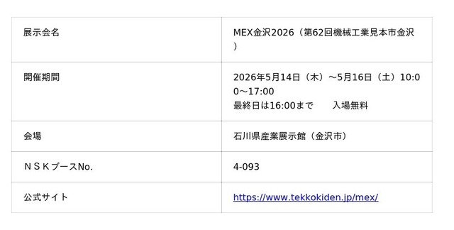 MEX金沢は、石川県産業展示館で毎年開催される、北陸地方最大級の機械工業見本市です。金属工作・加工機械や、電機・電子関連機器などの流通促進と技術交流をはかり、産業と貿易の振興発展に寄与することを目的としています。今年は“心躍るテクノロジー 未来がここから動き出す”のテーマで開催されます。