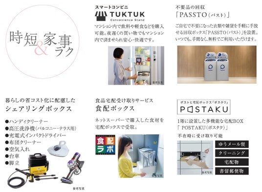 共用部には、スマートコンビニ「TUKTUK」や、不要品回収を行う「PASSTO」を導入。さらに、ハンディクリーナーや高圧洗浄機など「あったらいいな」と思う製品を住民同士で共同利用できる「シェアリングボックス」、ネットスーパーで購入した食材の受け取りが可能な「食配ラボ」、宅配物の受け取りに便利な宅配ボックス「POSTAKU」など、多彩なサービスを備えています。
