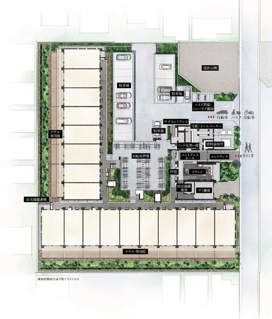 ※掲載の敷地配置図完成予想イラストは、設計図書を基に描いたもので、色調や仕上げ材の表現、植栽は実際とは異なります。また、官公庁の指導や施工上の都合により設計・仕様・植栽等に変更が生じる場合があります。なお、植栽については、植栽計画を表現したものであり、特定の四季の開花状況を示すものではありません。竣工時の植栽は完成予想図程度に成長しておりません。あらかじめご了承ください。