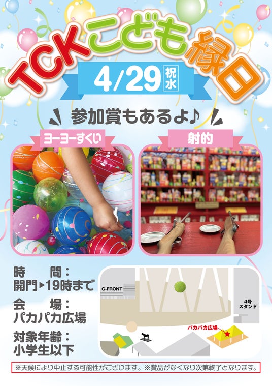 4月29日(祝・水)は、パカパカ広場で縁日イベントを開催します。小学生以下のお子様が無料でお楽しみいただけますので、ぜひこの機会にご家族連れで大井競馬場にお越しください。