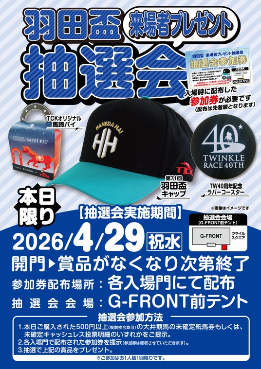 東京シティ競馬(TCK)は、大井競馬第2回開催(4/27~5/1)にて、3歳ダート三冠競走の初戦「羽田盃(JpnI)」と南関東3歳牝馬クラシックの二冠目「東京プリンセス賞(SI)」を実施!TCK 公式 YouTube ライブ番組「ウマきゅん」では、今開催も多彩なレギュラー陣とスペシャルゲストが最終レースまで楽しいトークを交えて予想を配信するほか、今年からデザインを刷新した羽田盃レーシングプログラムの来場者プレゼントや、2026羽田盃キャップなどが当たる抽選会、パカパカ広場で開催する縁日イベントをはじめ、お楽しみいただけるイベントを多数実施します。