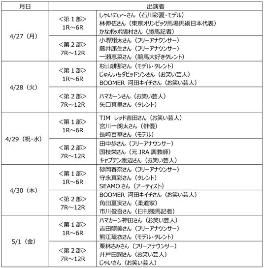 4月29日(祝・水)と4月30日(木)は、TCKに精通する出演陣が重賞などの予想に挑戦するトークステージを実施します。当日は、ぜひトゥインクルステージにお越しください。