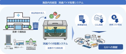 NTTビジネスソリューションズ株式会社(本社:大阪府大阪市、代表取締役社長:木上 秀則、以下、「NTTBS」)と株式会社ウエルクリエイト(本社:福岡県北九州市、代表取締役:松尾 康志、以下、「ウエルクリエイト」)は、病院および介護施設などを主要対象とした「施設内完結型 消滅バイオ処理システム」(以下、「本システム」)の提供を2026年5月1日(金)より開始します。