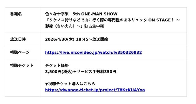 株式会社ドワンゴは、2026年4月30日(木)にLINE CUBE SHIBUYA(渋谷公会堂)にて開催される、色々な十字架 5th ONE MAN SHOW「タケノコ狩りなどで山に行く際の専門性のあるリュック ON STAGE! ~彩縁(さいえん)~」を、ニコニコ生放送にて独占生中継いたします。