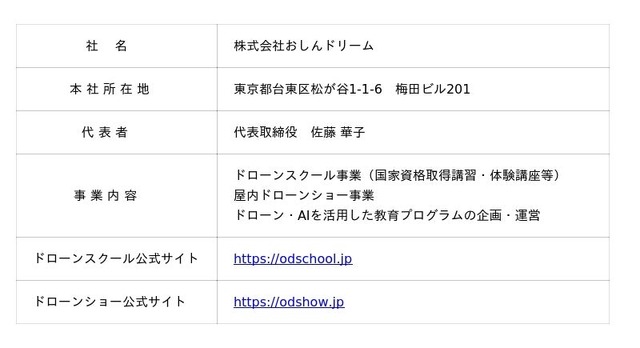 おしんドリームが運営する「おしんドローンスクール」は、無人航空機操縦士(国家資格)の取得を目的とした登録講習機関です。地域体験型講習・少人数制カリキュラムを特長とし、東京・伊豆大島、浜松、神奈川など全国に展開。2026年は鴨川(千葉)・小鹿野(埼玉)など関東圏をさらに拡充予定です。さらに2025年12月からは屋内ドローンショー事業にも取り組み始めました。