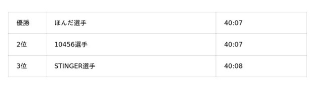 「捲り切って、1位のゴール!!」というJustive7氏の絶叫とともに、見事U600の部のチャンピオンの座に輝いたのは芋掘り人間選手。