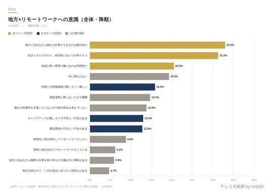 続いて、「地方に住みながらリモートワークで働くことについて、あなたの考えに近いものをすべてお選びください。すでに地方在住の方は、実感としてお答えください。」と、「地方×リモートワーク」に対する意識を尋ねた。すると、「地方に住みながら都心の仕事ができるのは魅力的だ」が33.0%で最も多かった(【図表4】)。そして、「生活コストが下がり、経済的にゆとりが持てそう」31.3%、「自然が多い環境で働けるのは理想的だ」20.5%と続いた。