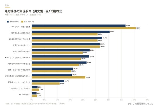 地方移住の実現条件を男女別にみると(男性n=527、女性n=478)、「フルリモートで働ける仕事」は女性40.6%・男性36.6%で、女性が4.0ポイント上回った。「地方でも都心と同等の給与」は男性30.4%・女性25.7%となり、男性が4.7ポイント上回る(【図表6】)。「交通アクセスが良いこと」は男性26.6%・女性26.6%で差はみられなかった。