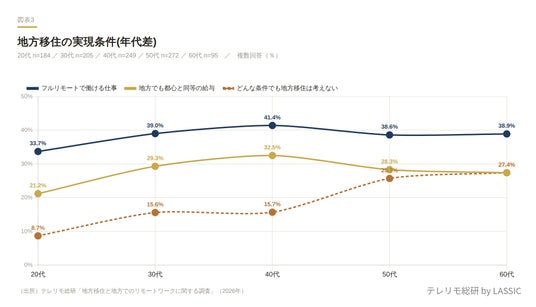 3項目を比べると、「どんな条件でも地方移住は考えない」の18.7ポイント差が最も大きかった。「地方でも都心と同等の給与」の11.3ポイント差、「フルリモートで働ける仕事」の7.7ポイント差と続く。「フルリモートで働ける仕事」は、3項目のなかで年代差が最も小さい項目となった。