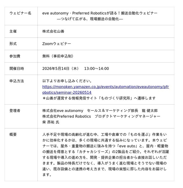 株式会社eve autonomy(イヴ・オートノミー、本社:静岡県磐田市、代表取締役CEO:星野亮介、以下「eve autonomy」)は、株式会社山善(以下「山善」)が2026年5月14日(木)に主催するウェビナー「eve autonomy・Preferred Roboticsが語る!搬送自動化ウェビナー ― つなげて広がる、現場搬送の自動化 ―」に登壇することをお知らせします。