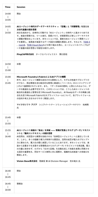 「AIエージェントに最適なTiDBの活用法」「Microsoftが提供するAIの最適解」、そして「Vision Baseによる即戦力の生成AI導入ノウハウ」という、次世代AI活用に不可欠な3つの実践的知見を一挙に習得することができます。TiDBやMicrosoft Foundry + Fabric、となりのAIシリーズが初めてという方も大歓迎です。ぜひ、お気軽にご参加ください。