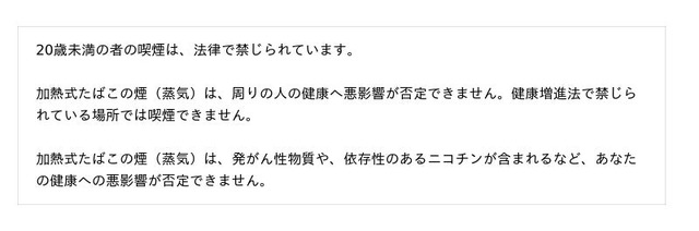 BATグループでは、たばこ製品のマーケティングを適切に実施するために国際的な自主規準を設定しています。そのため消費者に対するたばこ製品に関するすべてのコミュニケーションには、20歳未満の方へのコミュニケーションをお控えいただくとともに、「喫煙と健康に関する注意文言」を表示することを関係各位にお願いしております。加熱式たばこに関しては、記事掲載していただく際には、「健康に関する注意文言」が表示されるようご配慮いただきたく存じます。ご協力の程、何卒よろしくお願い申し上げます。