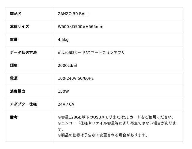 「ZANZO-50 BALL」は、縦軸を中心として4本の弧を描くLEDブレードが横方向に回転する革新的な機構を採用 。