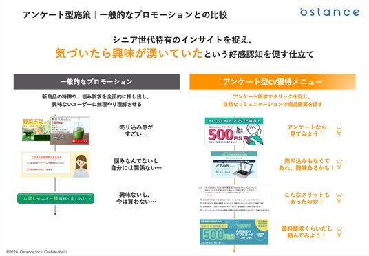 今回の施策の中核となったのが、オースタンスが独自に設計する「アンケート型CV獲得施策」です。シニア世代は「売り込み」に対して感度が高く、従来の広告では関心を持ってもらいにくいという課題があります。本施策では、アンケート形式を活用することで、ターゲットが「売り込まれている」と感じることなく、自然に商材への理解・興味が深まる体験を設計します。