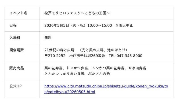 5月5日(火・祝)「松戸モリヒロフェスタ~こどもの王国~」にて、マンヨーケン(万葉軒)が初出店!親子の絆が深まるような体験型のワークショップ、キッチンカー、物販が充実!