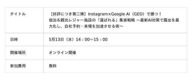 株式会社ロカオプ(本社:大阪府大阪市 代表取締役:縣将貴、以下:ロカオプ)は、5月13日(水)14:00より無料のオンラインセミナー『【好評につき第二弾】Instagram×Google AI(GEO)で勝つ!宿泊&観光レジャー施設の「選ばれる」集客戦略 ~最新AI対策で露出を最大化し、自社予約・来場を加速させる術~』を開催いたします。