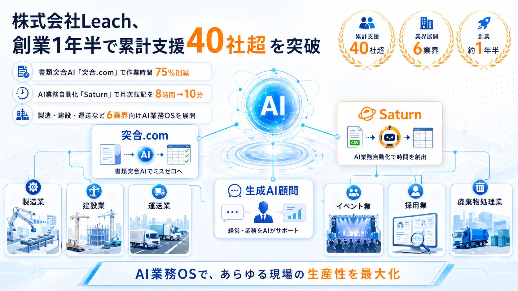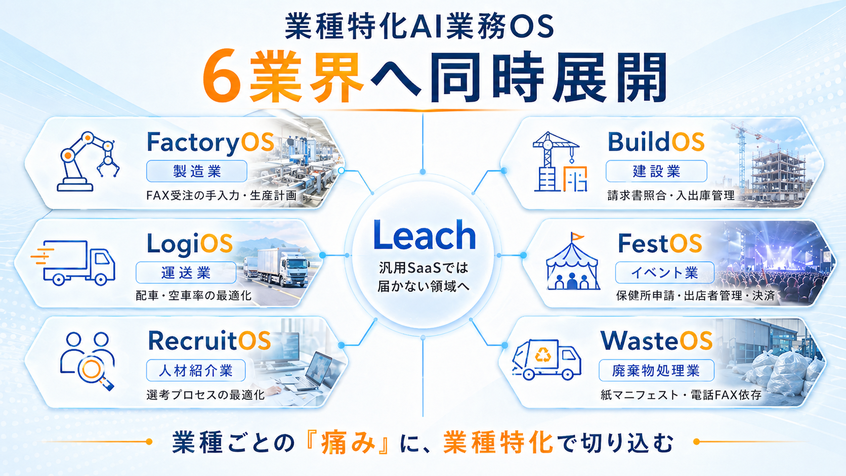 Leachは現在、業種ごとの課題に最適化したAI業務OSを6つの業界で同時に展開しています。