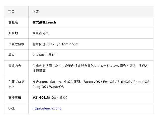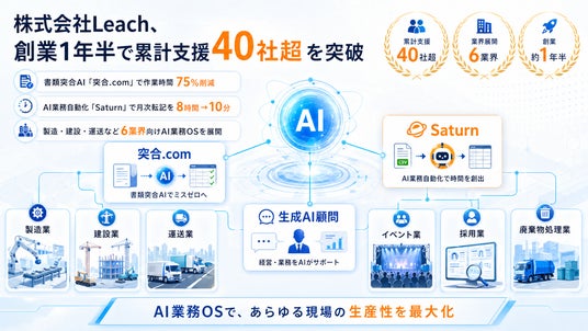 株式会社Leach(本社:東京都港区、代表取締役:冨永拓也)は、2024年11月の創業から約1年半で、生成AI顧問・業務自動化サービスの累計支援先が40社超(個人含む)に到達したことをお知らせします。