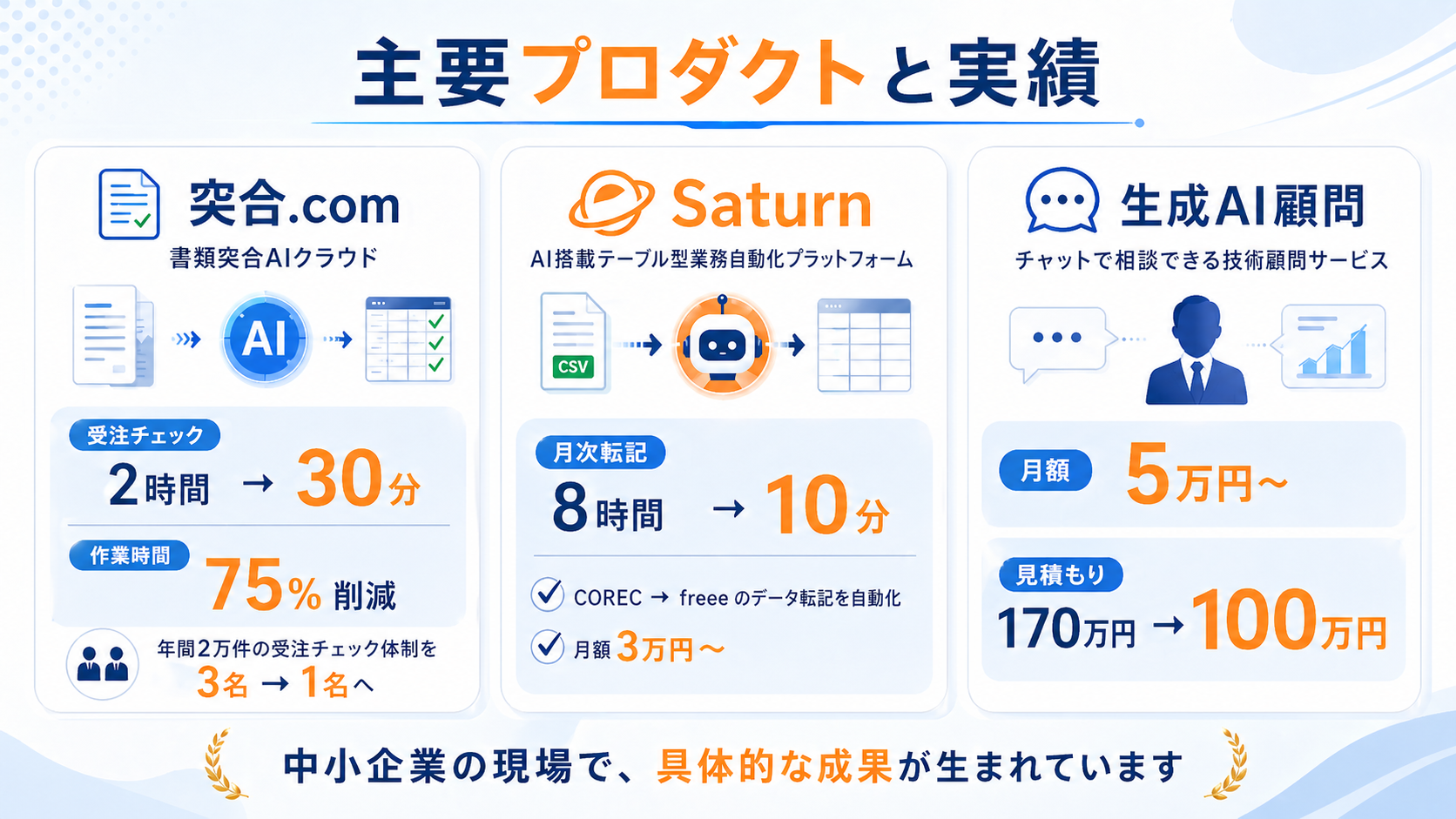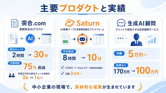 書類突合AIクラウド「突合.com」では作業時間75%削減、AI業務自動化プラットフォーム「Saturn」では月次転記作業を8時間から10分へ短縮するなど、中小企業の現場で具体的な成果が生まれています。