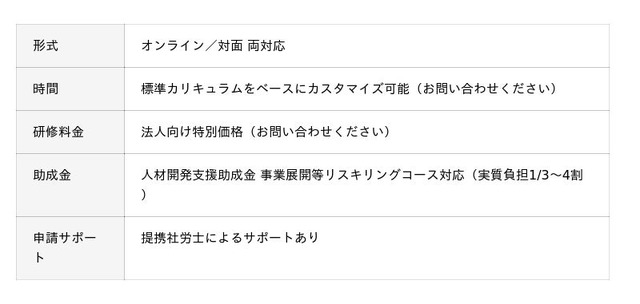 - 人材開発支援助成金 申請サポート付き:提携社労士による申請代行サポートにより、実質負担を1/3~4割まで圧縮可能