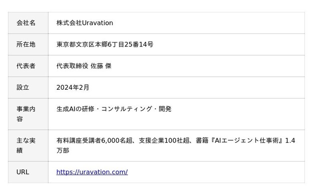 株式会社Uravation 代表取締役。生成AI分野で、法人向けAI研修・AI顧問・AIエージェント開発、個人向けAI実践講座、出版・連載執筆まで多岐にわたる事業を展開。Claude Codeのヘビーユーザーとして、自社の研修運営、執筆、SNS運用、請求書発行など業務の大部分を自動化しています。著書に『AIエージェント仕事術 仕事時間は1/100に 成果は120%になる』(SBクリエイティブ、2026年2月27日発売、累計1.4万部突破)があります。