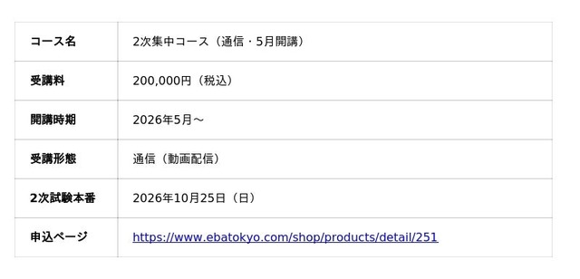 2026年10月25日(日)に実施される2次試験(筆記)まで残り約6か月。ゴールデンウィークからの学習スタートに合わせた本クラスの追加により、令和8年度合格を目指すすべての方が最適なタイミングで本格的な対策を始められる環境を整えました。