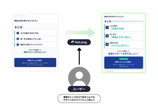 AI編集モードでは、「『NoLang』の文字色を緑に変更」「左上の三角形の図形が余計なので消去」「もっとシンプルなスライドにしたい。分量を80%に減らし、文字サイズを大きく」といった自然言語の指示文を入力するだけで、AIが該当ページのデザイン・文言を書き換えます。フィードサイズに収まるレイアウトを保ったまま、細部の調整が可能です。