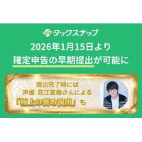 「タックスナップ」、2026年1月15日より確定申告の早期提出が可能に。提出完了時には声優・花江夏樹さんが「極上の褒め演出」で称賛。