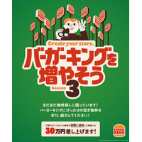 過去2回で合計23店舗が成約した「バーガーキング(R) を増やそう」のシーズン3開始!3回目は成約したら“30万円”差し上げます!更なる店舗拡大のため空き物件をご紹介ください!応募でクーポンプレゼント!
