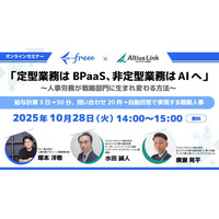 10月28日(火)freee×アルティウスリンク 共催オンラインセミナー開催「 『定型業務はBPaaS、非定型業務はAIへ』 ~人事労務が戦略部門に生まれ変わる方法~」