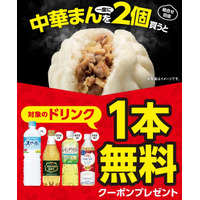 期間中、対象の中華まんを一度に2個(組合せ自由)買うと、次回から使える対象のドリンク1本無料クーポンをプレゼント!